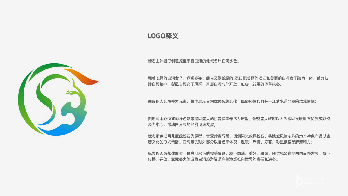 圖形的中心位置的綠色彩帶是以盛大的拼音首字母"S為原型,體現盛大旅游以人為本以發(fā)展地方優(yōu)質旅游資源為中心,帶動白河縣的經濟飛速發(fā)展;